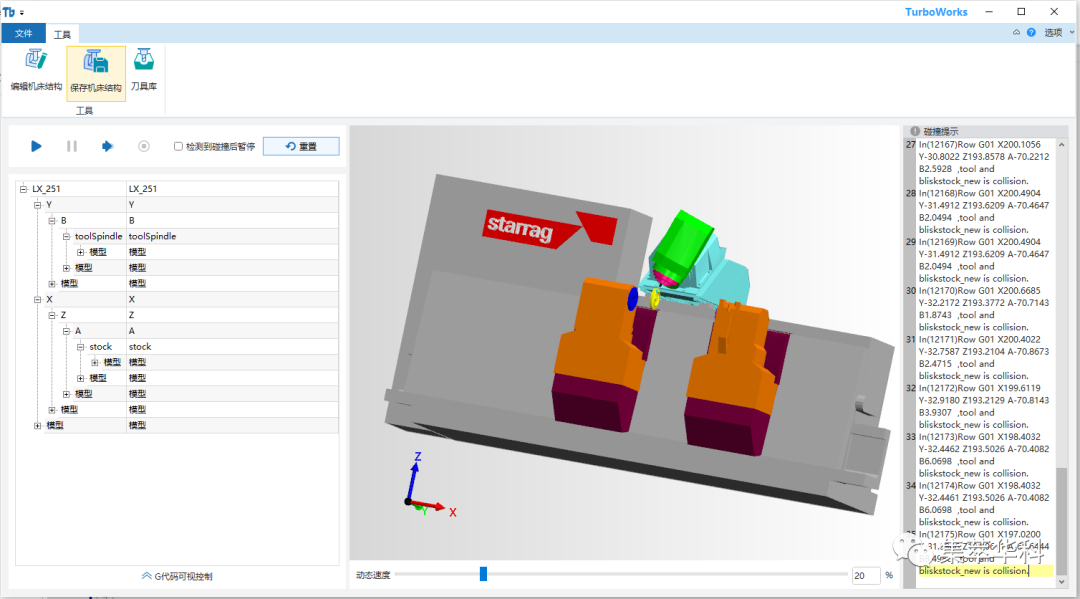 機床仿真功能同時(shí)支持直接基于刀位文件的實(shí)時(shí)后置運動(dòng)仿真。
